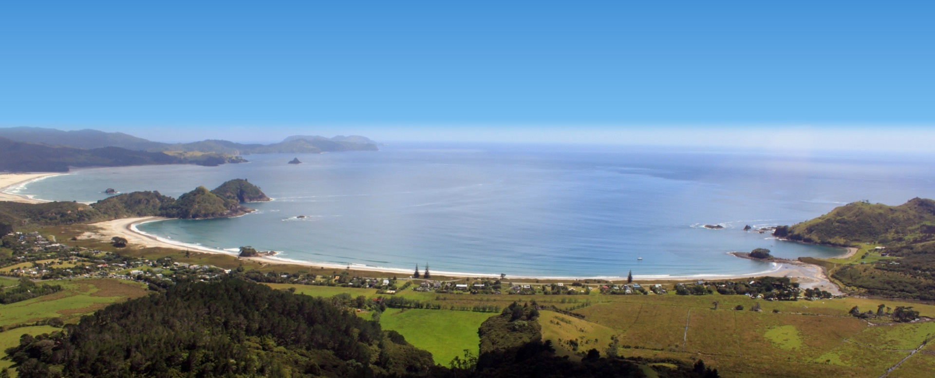 Three extraordinary homes on fourteen acres of native bush and farmland at Medlands Beach, Great Barrier Island — Aotea. No grid power. No noise. New Zealand's only International Dark Sky Sanctuary. Just the island, doing what it does.
